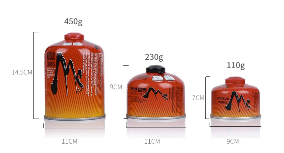 我日常在JD购买的大都是这种气罐,不过我购买的主要是230G的气罐为主,450G 的感觉略重略大,一个230G的气罐可支持2-3小时候的燃烧时间,基本可以满足一天的出行。